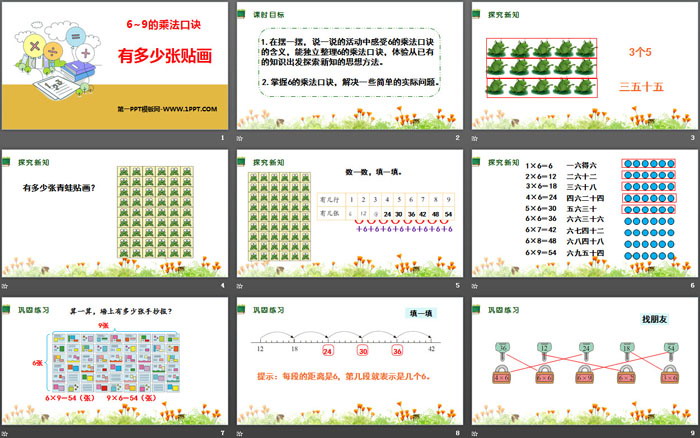 关键词:北师大版二年级上册数学PPT课件免费下载,有多少张贴画PPT下载,6~9的乘法口诀PPT下载,.PPT格式;