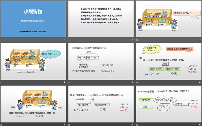 关键词:北师大版三年级上册数学PPT课件免费下载,小熊购物PPT下载,混合运算PPT下载,乘减混合运算及其应用PPT下载,.PPT格式;