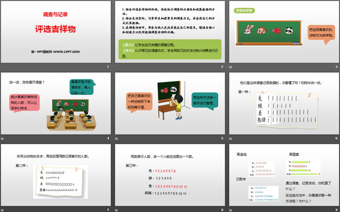 关键词:北师大版二年级下册数学PPT课件免费下载,评选吉祥物PPT下载,调查与记录PPT下载,.PPT格式;