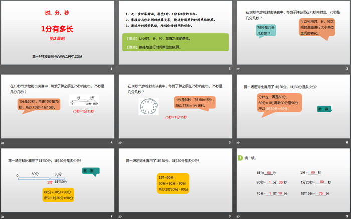 关键词:北师大版二年级下册数学PPT课件免费下载,1分有多长PPT下载,时分秒PPT下载,.PPT格式;