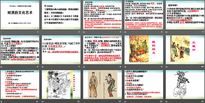 了解明清古典小说的成就;明清戏剧的繁荣、书法绘画成就。