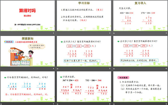 关键词:北师大版二年级下册数学PPT课件免费下载,算得对吗PPT下载,加与减PPT下载,.PPT格式;