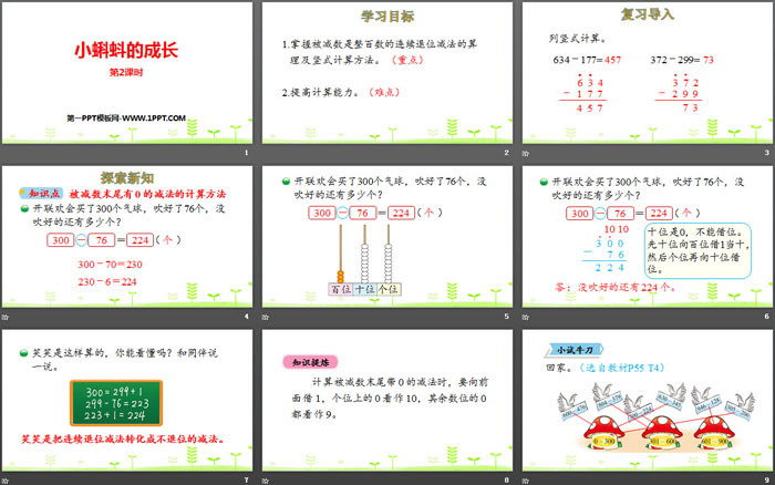 1.掌握被减数是整百数的连续退位减法的算理及竖式计算方法。 (重点)