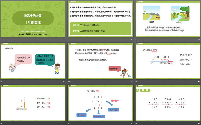 关键词:北师大版二年级下册数学PPT课件免费下载,十年的变化PPT下载,加与减PPT下载,.PPT格式;