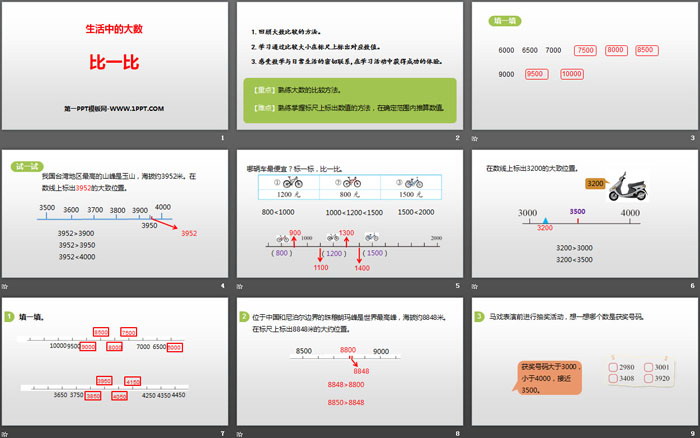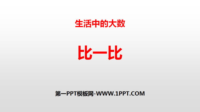 关键词:北师大版二年级下册数学PPT课件免费下载,比一比PPT下载,生活中的大数PPT下载,.PPT格式;