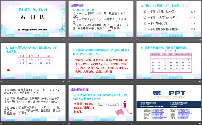 关键词:北师大版三年级上册数学PPT课件免费下载,看日历PPT下载,年月日PPT下载,.PPT格式;
