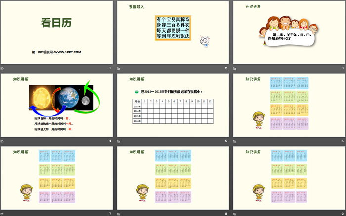 关键词:北师大版三年级上册数学PPT课件免费下载,看日历PPT下载,年月日PPT下载,.PPT格式;