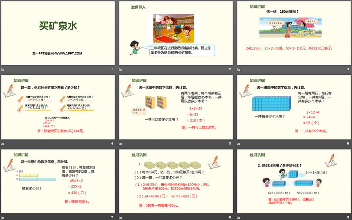 关键词:北师大版三年级上册数学PPT课件免费下载,买矿泉水PPT下载,乘法PPT下载,.PPT格式;