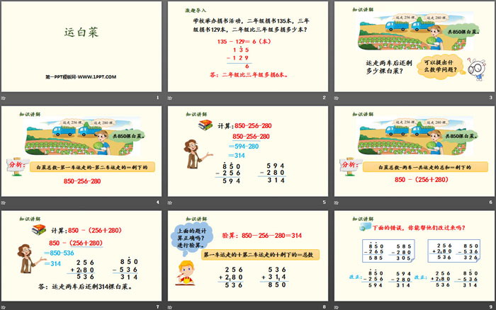 关键词:北师大版三年级上册数学PPT课件免费下载,运白菜PPT下载,加与减PPT下载,.PPT格式;
