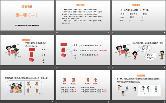 关键词:北师大版三年级上册数学PPT课件免费下载,看一看PPT下载,观察物体PPT下载,.PPT格式;