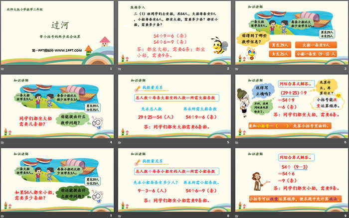 关键词:北师大版三年级上册数学PPT课件免费下载,过河PPT下载,混合运算PPT下载,带小括号的两步混合运算PPT下载,.PPT格式;