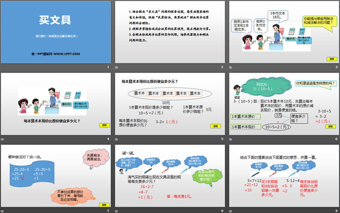 关键词:北师大版三年级上册数学PPT课件免费下载,买文具PPT下载,混合运算PPT下载,除减混合运算及其应用PPT下载,.PPT格式;