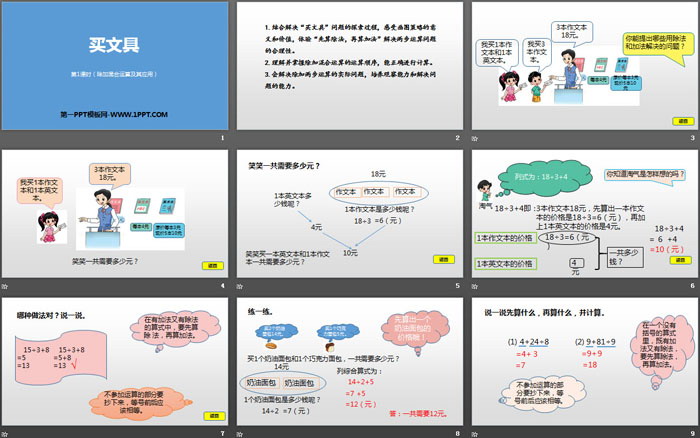 关键词:北师大版三年级上册数学PPT课件免费下载,买文具PPT下载,混合运算PPT下载,除加混合运算及其应用PPT下载,.PPT格式;