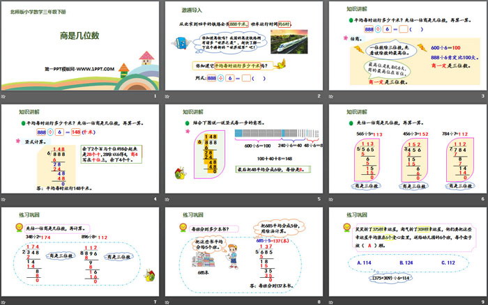 关键词:北师大版三年级下载册数学PPT课件免费下载,商是几位数PPT下载,除法PPT下载,.PPT格式;