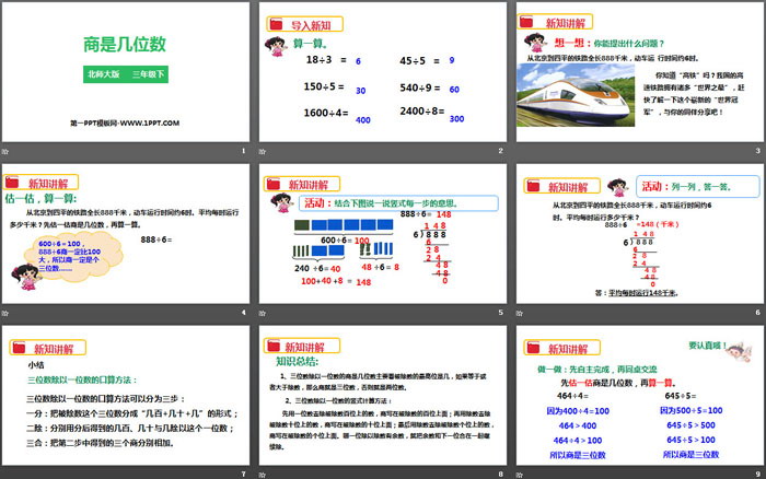 关键词:北师大版三年级下载册数学PPT课件免费下载,商是几位数PPT下载,除法PPT下载,.PPT格式;