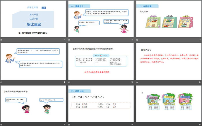 关键词:北师大版三年级上册数学PPT课件免费下载,货比三家PPT下载,认识小数PPT下载,.PPT格式;