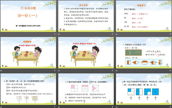 关键词:北师大版三年级下载册数学PPT课件免费下载,分一分PPT下载,认识分数PPT下载,.PPT格式;