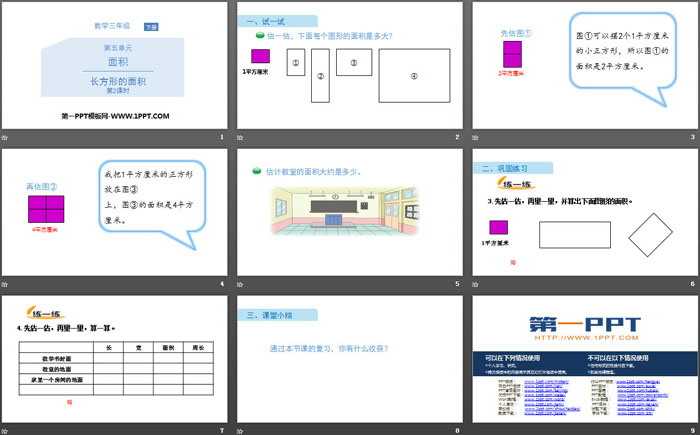 关键词:北师大版三年级下载册数学PPT课件免费下载,长方形的面积PPT下载,面积PPT下载,.PPT格式;
