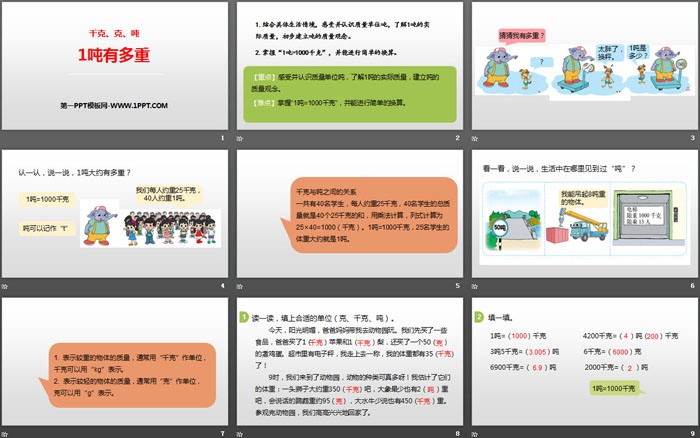 2.掌握“1吨=1000千克”,并能进行简单的换算。