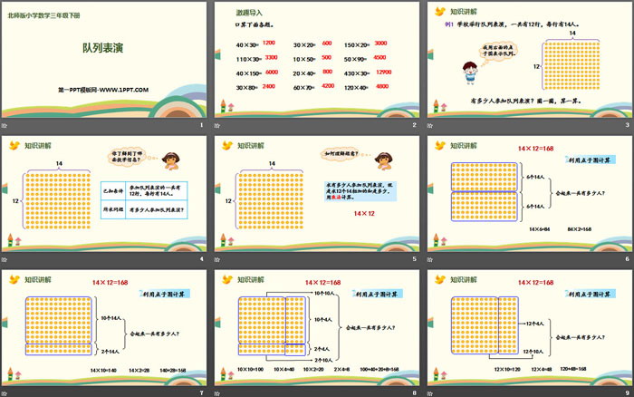 关键词:北师大版三年级下载册数学PPT课件免费下载,队列表演PPT下载,乘法PPT下载,.PPT格式;