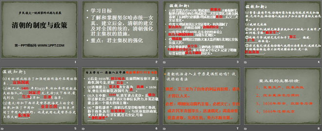 了解和掌握努尔哈赤统一女真、建立后金,清朝的建立及对全国的统治,清朝强化君主集权的措施。