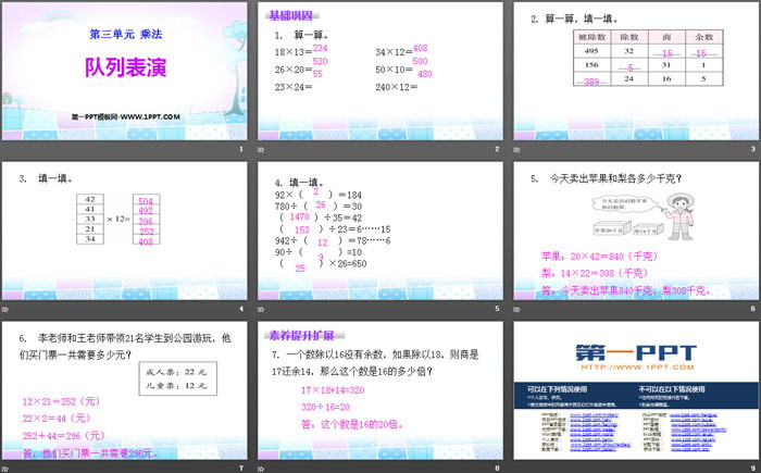关键词:北师大版三年级下载册数学PPT课件免费下载,队列表演PPT下载,乘法PPT下载,.PPT格式;