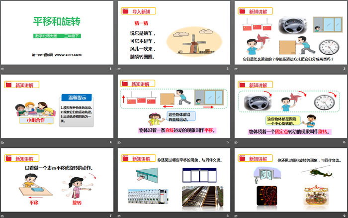 关键词:北师大版三年级下载册数学PPT课件免费下载,平移和旋转PPT下载,图形的运动PPT下载,.PPT格式;