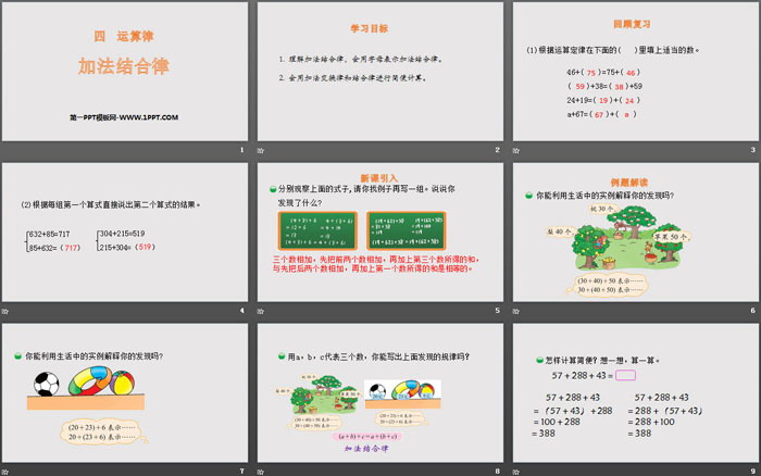 关键词:北师大版四年级上册数学PPT课件免费下载,加法结合律PPT下载,运算律PPT下载,.PPT格式;