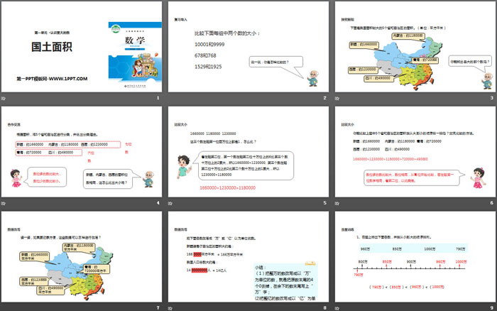 关键词:北师大版四年级上册数学PPT课件免费下载,国土面积PPT下载,认识更大的数PPT下载,.PPT格式;