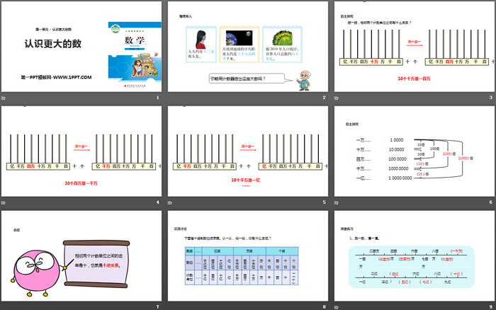 关键词:北师大版四年级上册数学PPT课件免费下载,认识更大的数PPT下载,.PPT格式;