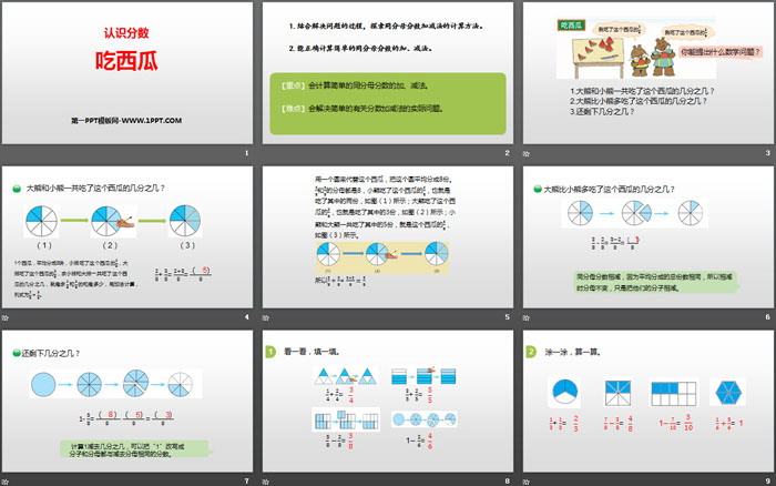 关键词:北师大版三年级下载册数学PPT课件免费下载,吃西瓜PPT下载,认识分数PPT下载,.PPT格式;