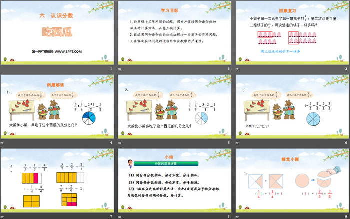 关键词:北师大版三年级下载册数学PPT课件免费下载,吃西瓜PPT下载,认识分数PPT下载,.PPT格式;