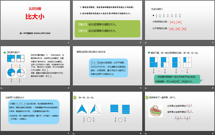 关键词:北师大版三年级下载册数学PPT课件免费下载,比大小PPT下载,认识分数PPT下载,.PPT格式;