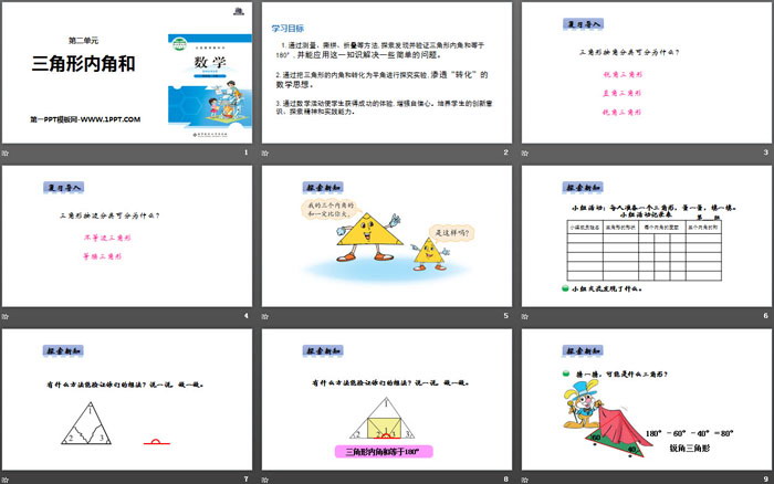 1. 通过测量、撕拼、折叠等方法,探索发现并验证三角形内角和等于180°,并能应用这一知识解决一些简单的问题。