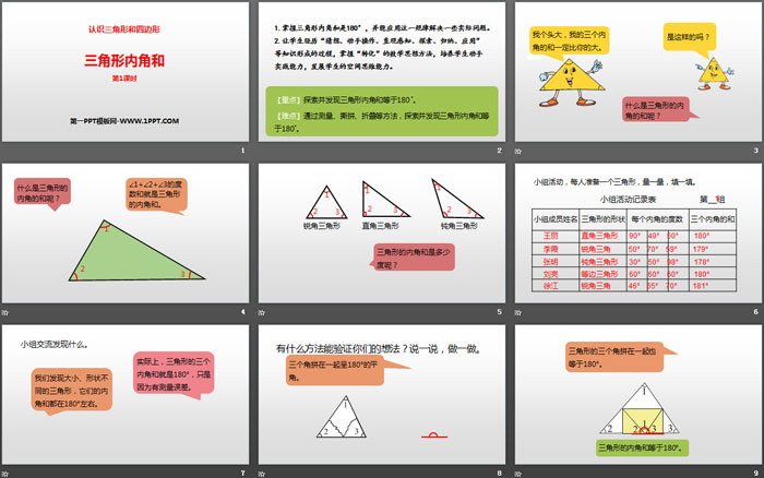 关键词:北师大版四年级下册数学PPT课件免费下载,三角形内角和PPT下载,认识三角形和四边形PPT下载,.PPT格式;