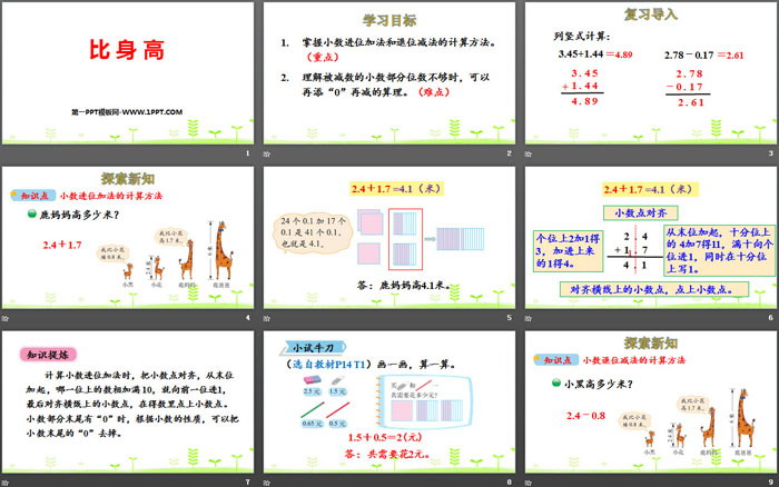 关键词:北师大版四年级下册数学PPT课件免费下载,比身高PPT下载,小数的意义和加减法PPT下载,.PPT格式;
