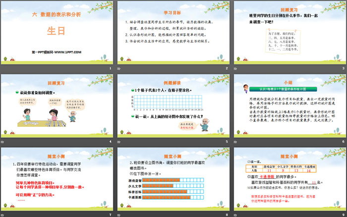 关键词:北师大版四年级下册数学PPT课件免费下载,生日PPT下载,数据的表示和分析PPT下载,.PPT格式;