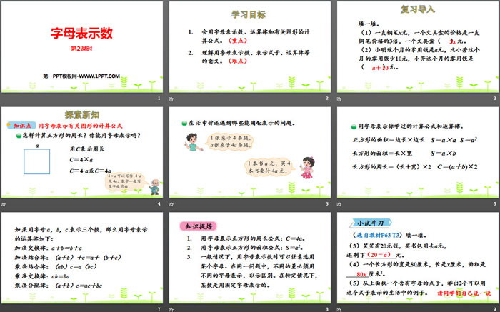 会用字母表示数、运算律和有关图形的计算公式。(重点)