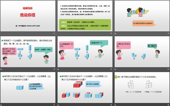 1.体会搭立体图形的操作过程,根据立体图形的正面、上面、侧面(左面或右面)的形状特征,确定所搭的立体图形。
