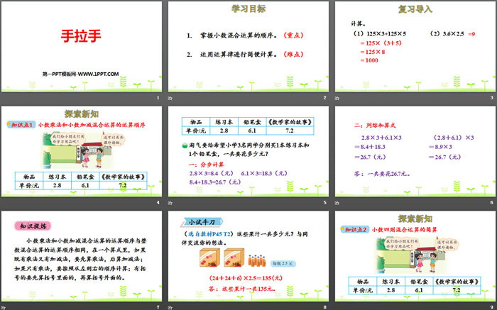 关键词:北师大版四年级下册数学PPT课件免费下载,手拉手PPT下载,小数乘法PPT下载,.PPT格式;