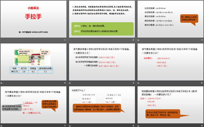 关键词:北师大版四年级下册数学PPT课件免费下载,手拉手PPT下载,小数乘法PPT下载,.PPT格式;