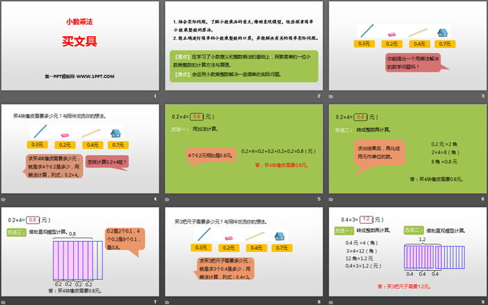 关键词:北师大版四年级下册数学PPT课件免费下载,买文具PPT下载,小数乘法PPT下载,.PPT格式;