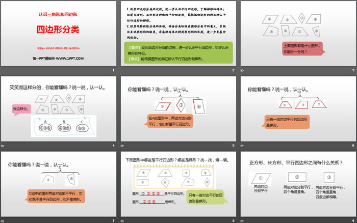 关键词:北师大版四年级下册数学PPT课件免费下载,四边形分类PPT下载,认识三角形和四边形PPT下载,.PPT格式;