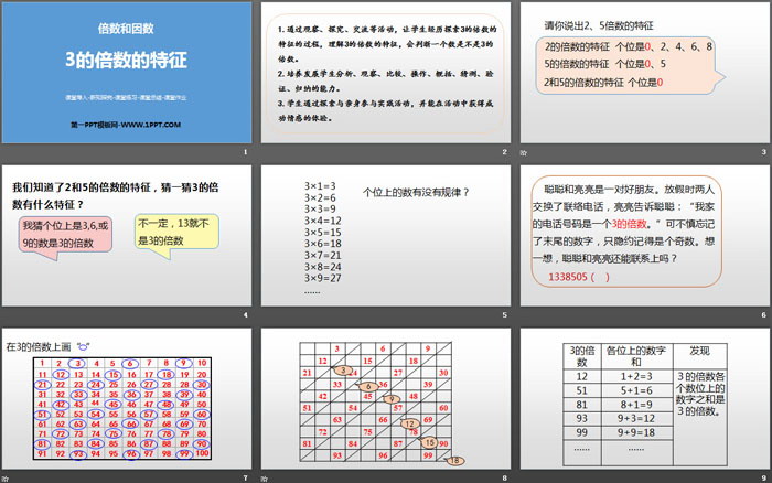 1.通过观察、探究、交流等活动,让学生经历探索3的倍数的特征的过程,理解3的倍数的特征,会判断一个数是不是3的倍数。