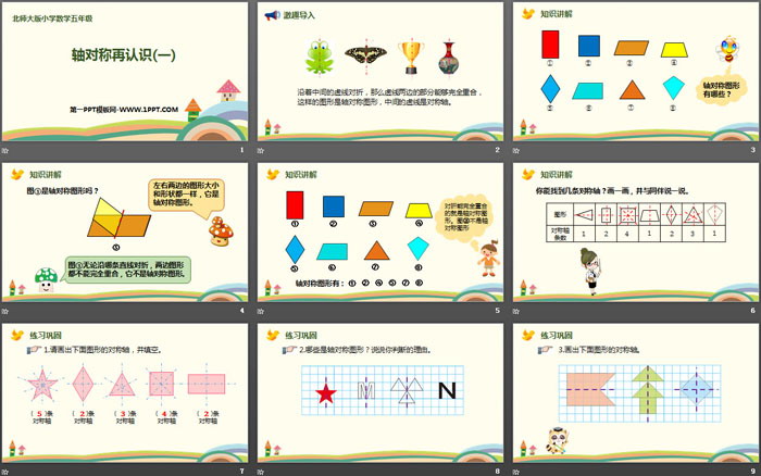关键词:北师大版五年级上册数学PPT课件免费下载,轴对称再认识PPT下载,轴对称和平移PPT下载,.PPT格式;