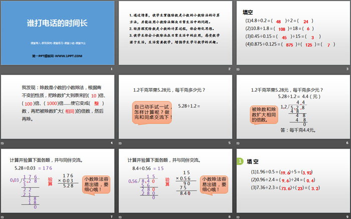 关键词:北师大版五年级上册数学PPT课件免费下载,谁打电话的时间长PPT下载,小数除法PPT下载,.PPT格式;