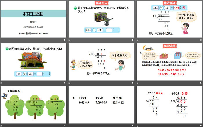 关键词:北师大版五年级上册数学PPT课件免费下载,打扫卫生PPT下载,小数除法PPT下载,.PPT格式;