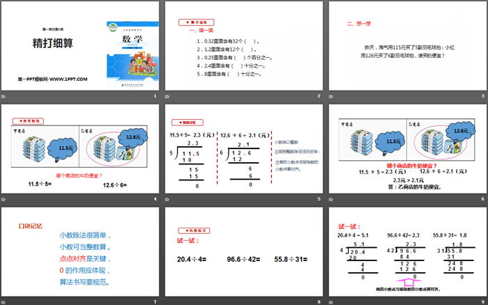 关键词:北师大版五年级上册数学PPT课件免费下载,精打细算PPT下载,小数除法PPT下载,.PPT格式;