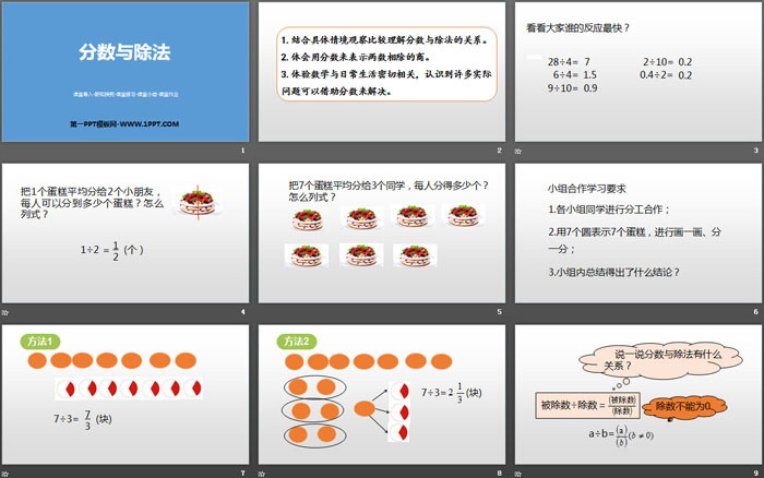 关键词:北师大版五年级上册数学PPT课件免费下载,分数与除法PPT下载,分数的意义PPT下载,.PPT格式;
