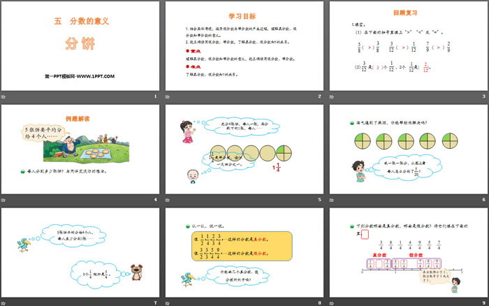 1.结合具体情境,经历假分数与带分数的产生过程,理解真分数、假分数和带分数的意义。